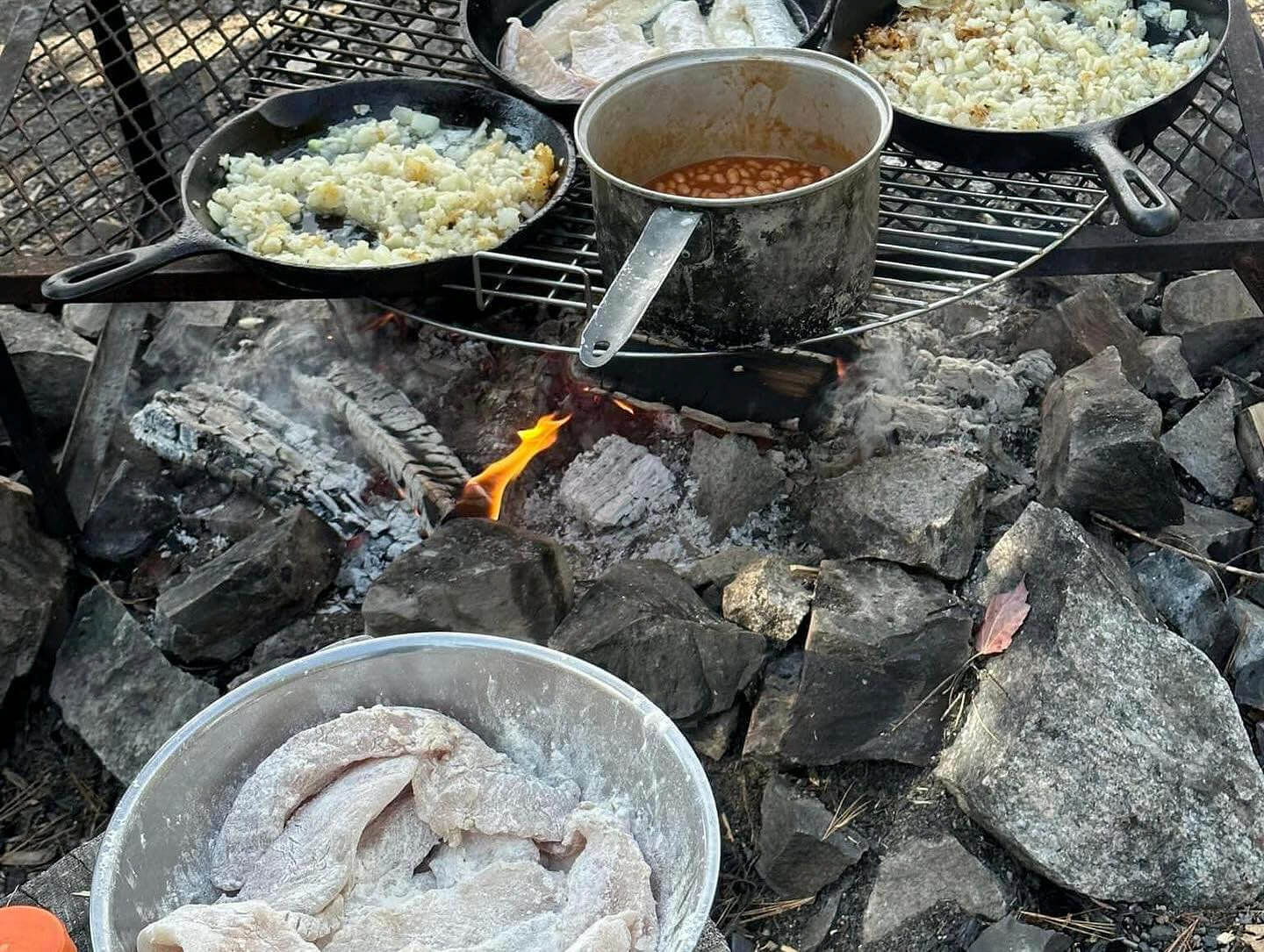 A big part of the northern experience is a shore lunch of fresh walleye. Our well-stocked shore lunch kit makes this experience much more enjoyable. Guests will be supplied new propane stoves, new bins, new dishes, cast iron fire pan, dishes, cups, cutlery, dish soap, cloth and leather fire glove. Our kitchen supplies beans, stew, veggies, cookies, cooking oil, flour, condiments and of course your walleye fillets.